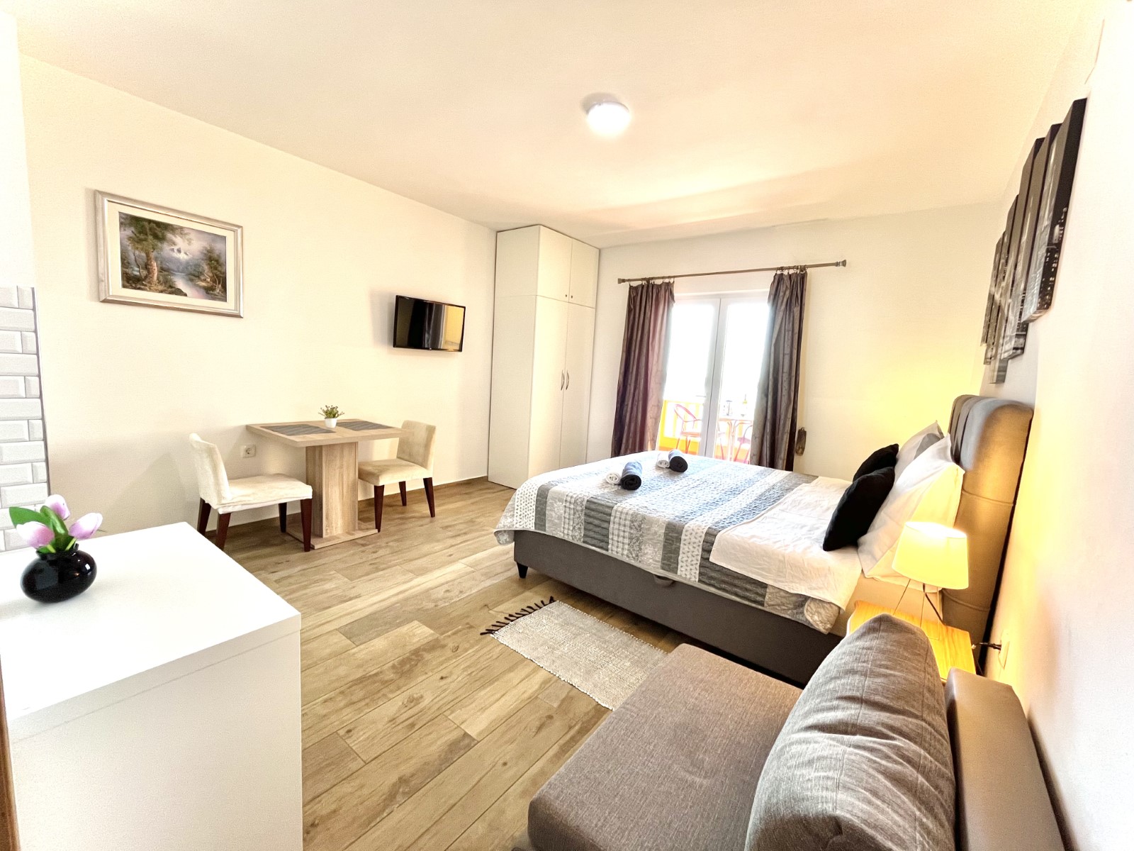 Apartment Studio Suite mit Balkon und Meerblick (2 Personen) verfügt über eine Küche und ein eigenes Bad. Wohnbereich verfügt über Sat-TV und AC. Kostenloses WLAN ist inbegriffen. Küche ist ausgestattet mit: