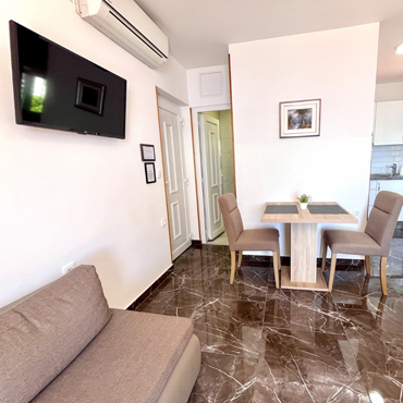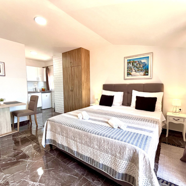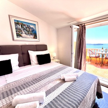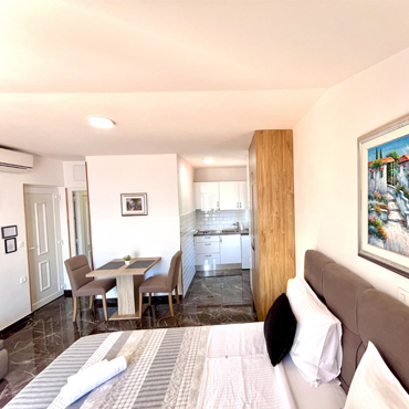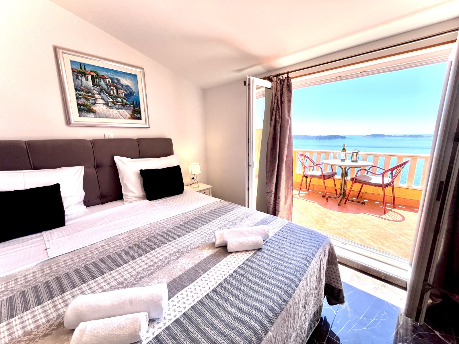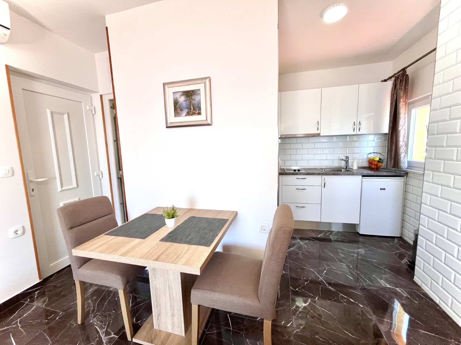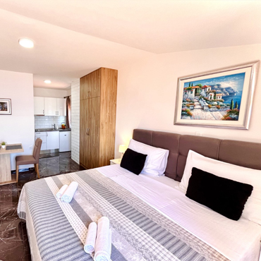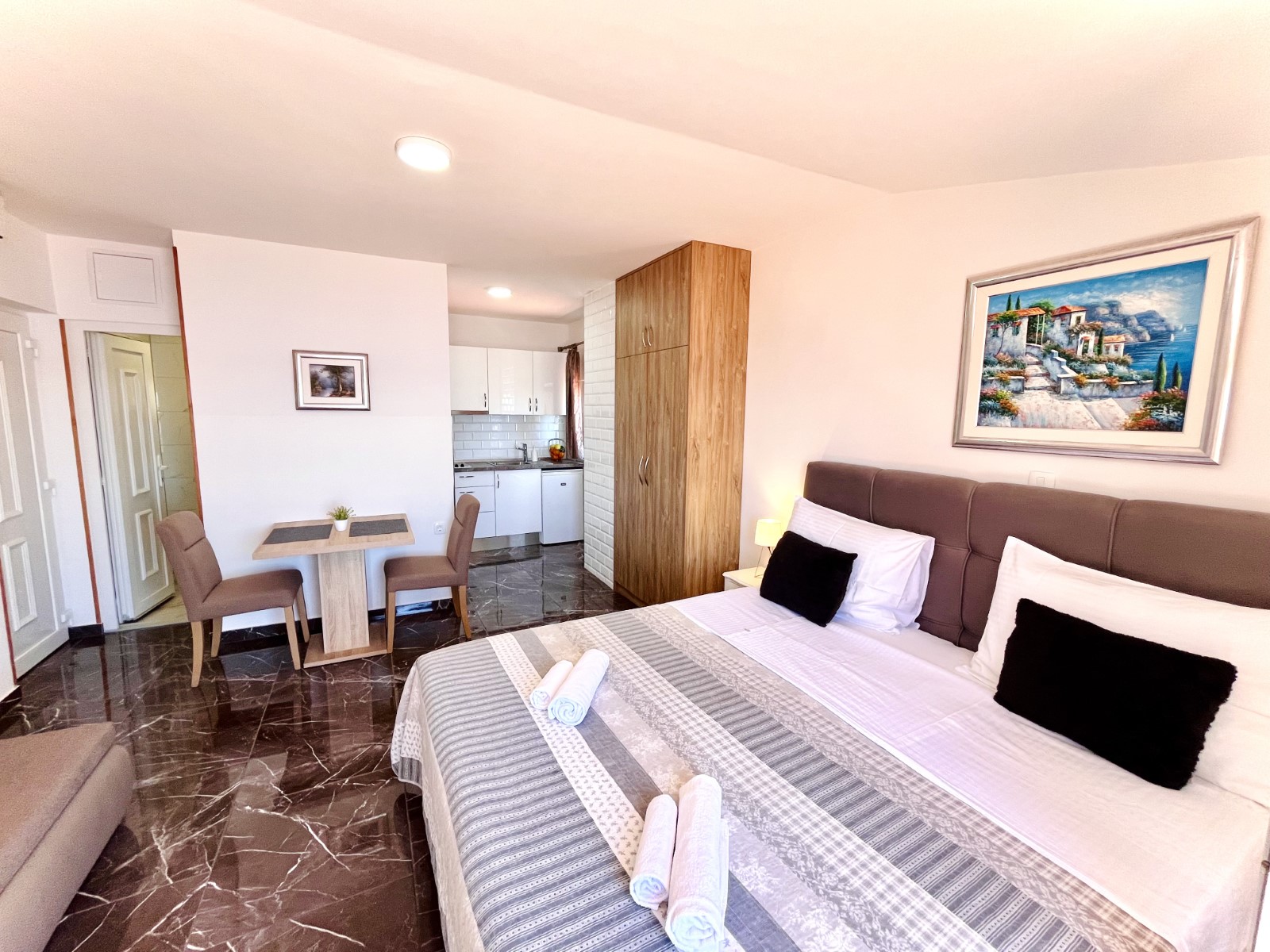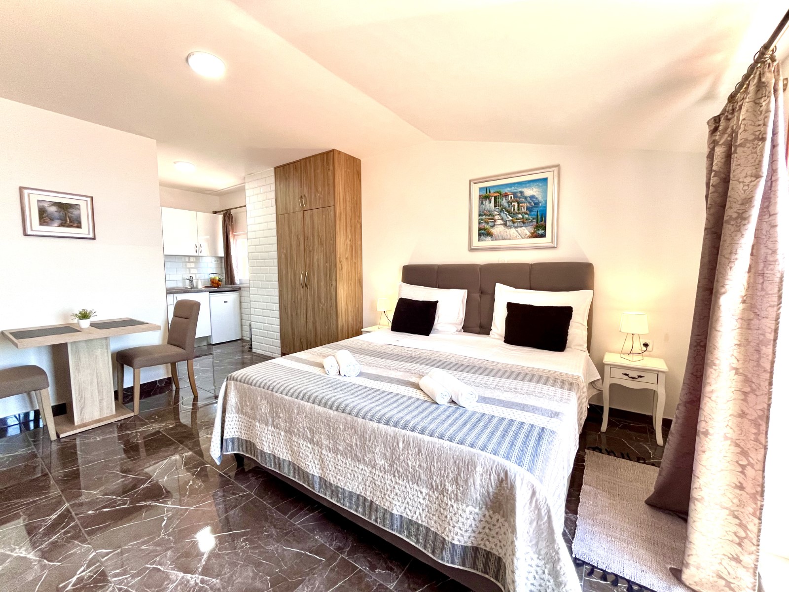 Appartamento monolocale panoramico con balcone e vista mare (2 persone) dotato di cucina e bagno privato. La zona giorno dispone di TV con canali satellitari e aria condizionata. La connessione Wi-Fi gratuita è inclusa. La cucina è dotata di: