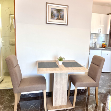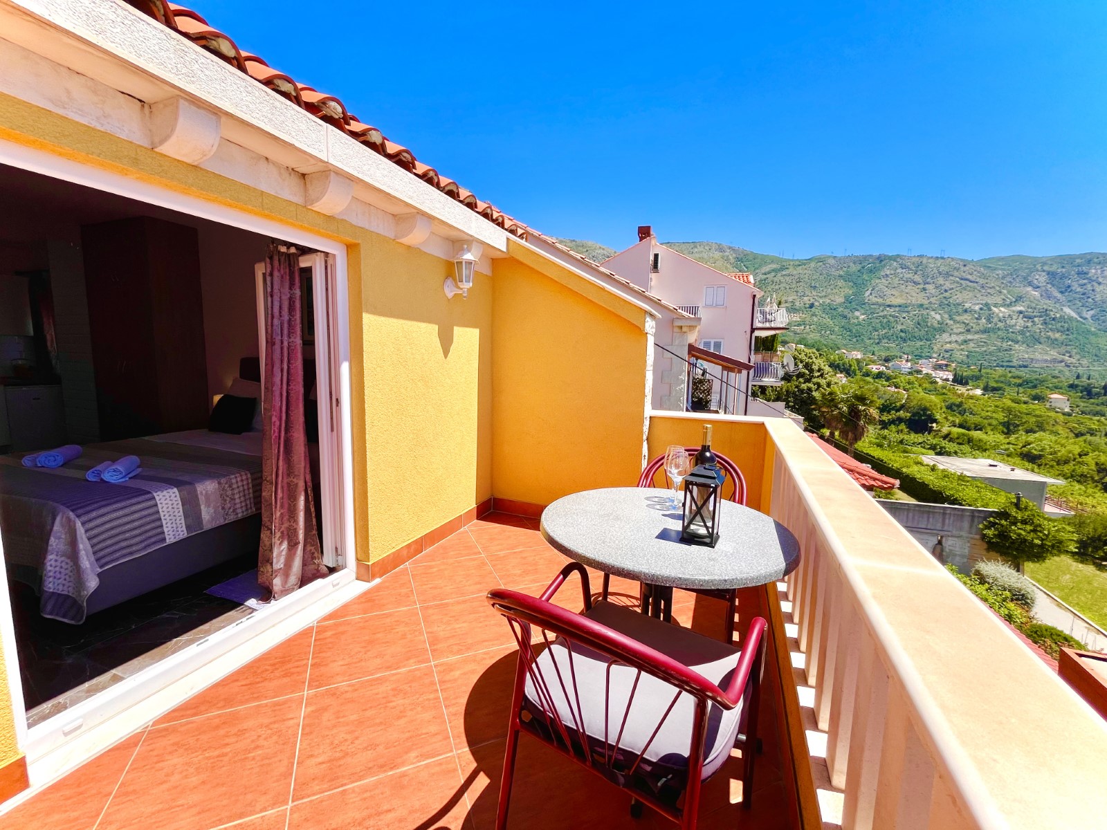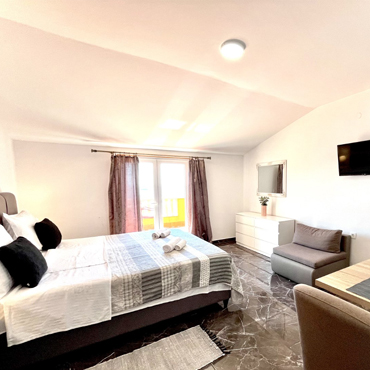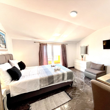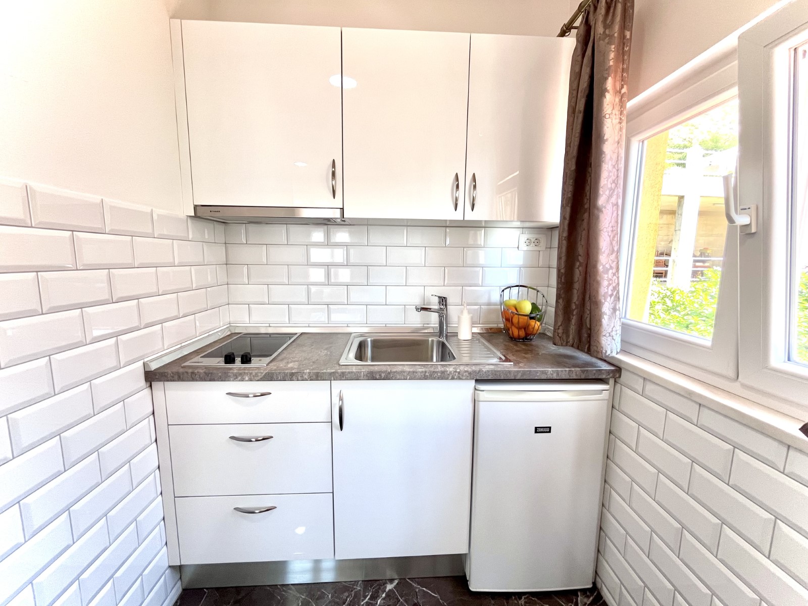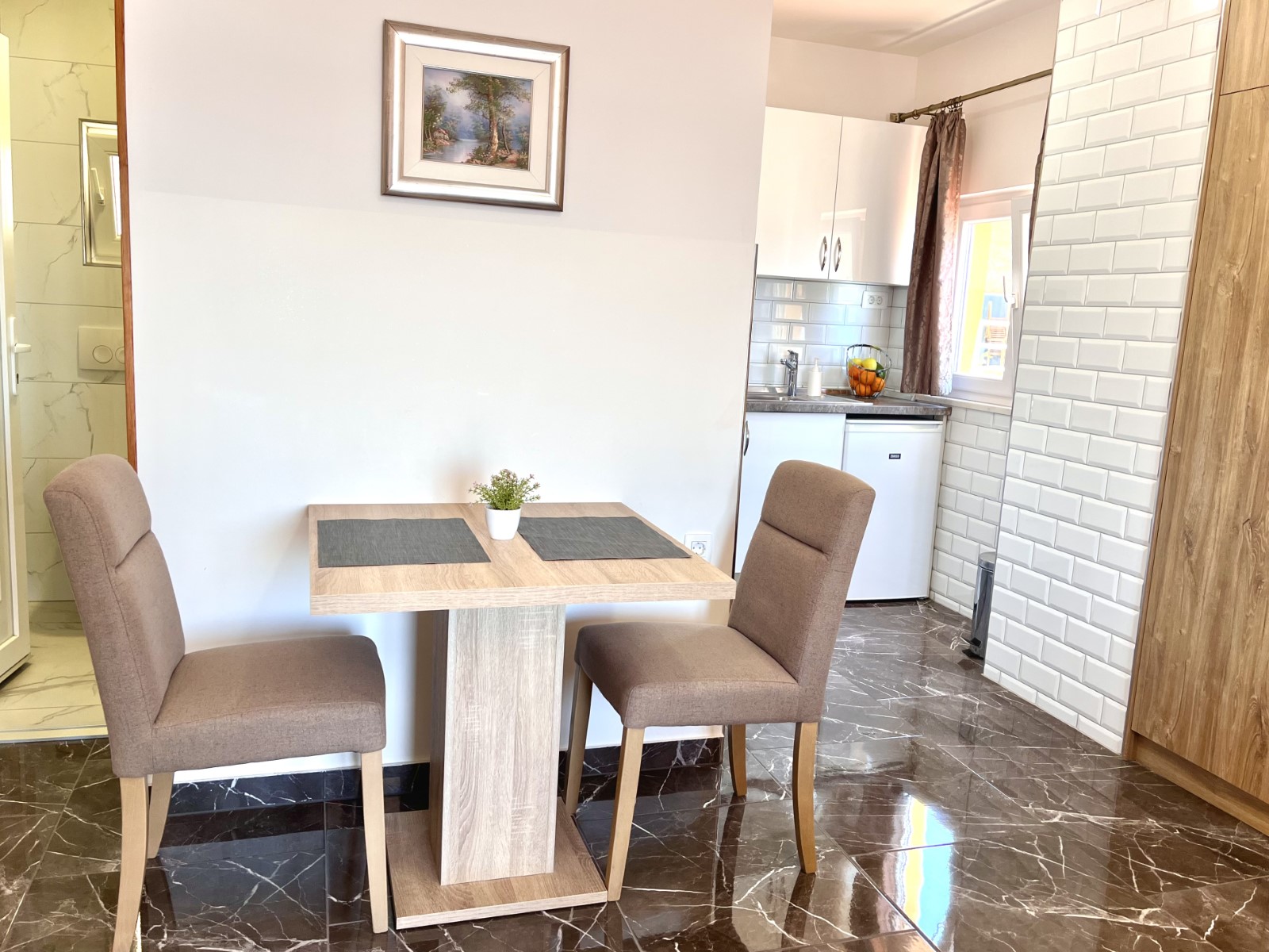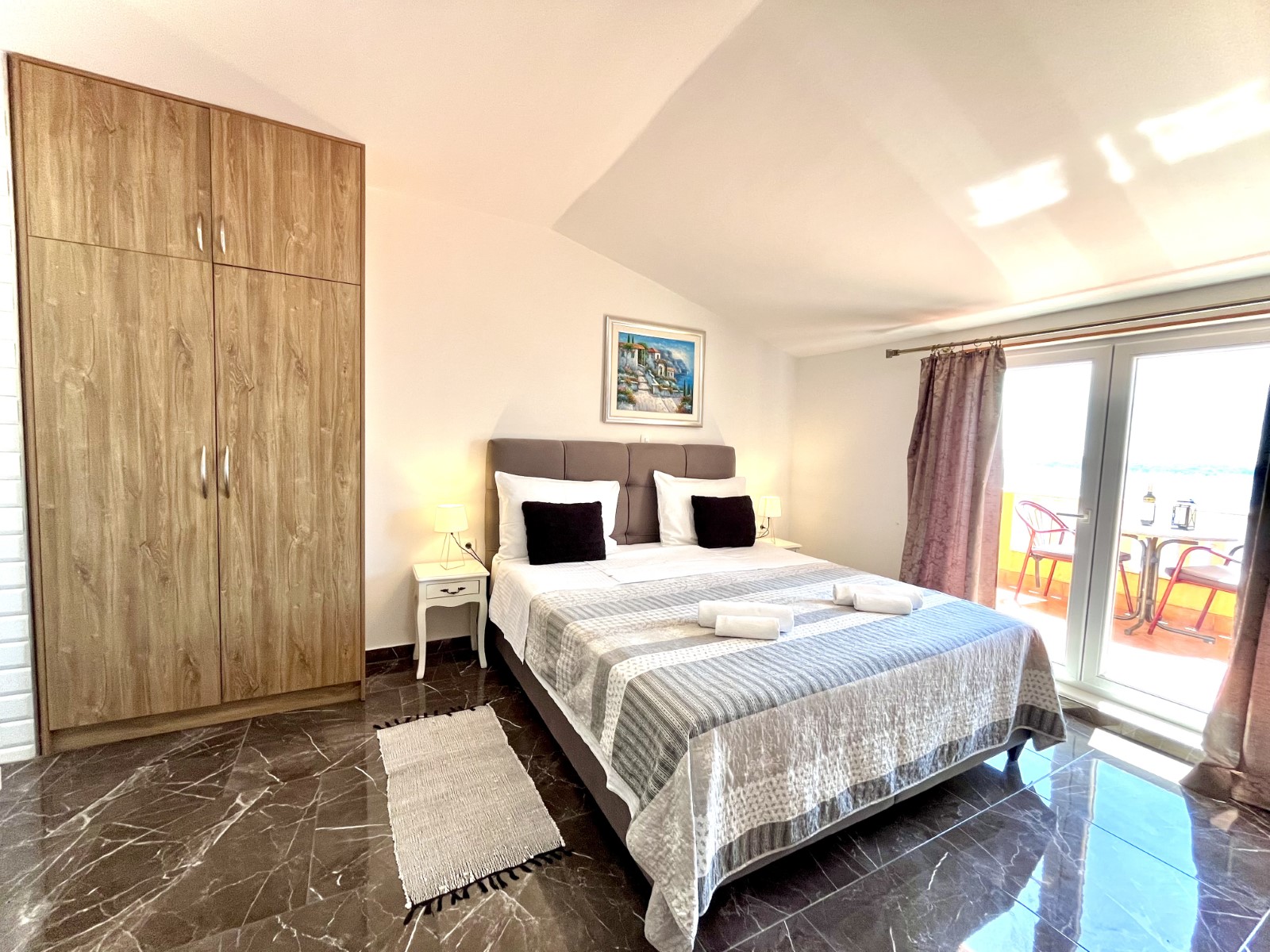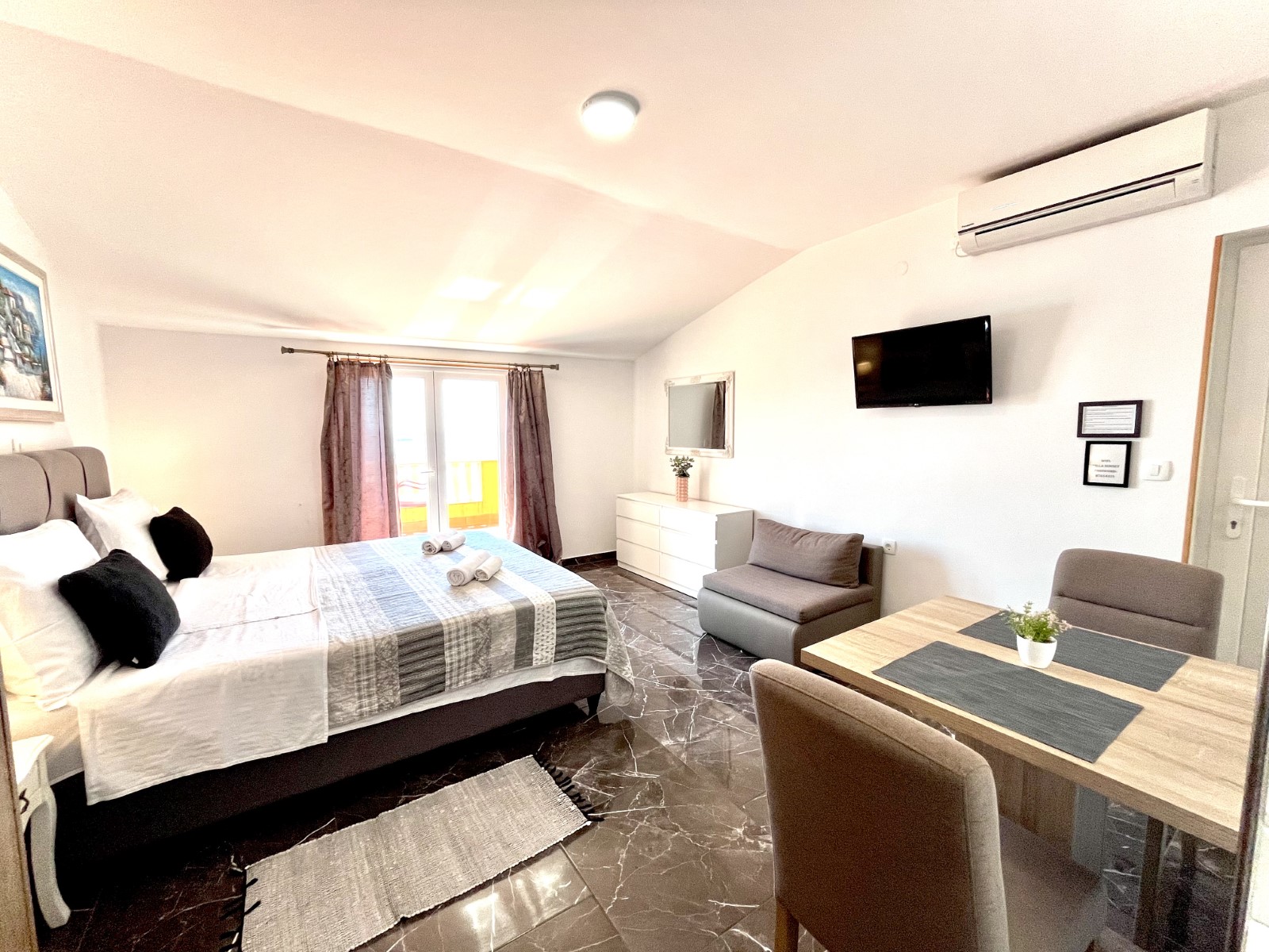 Appartamento monolocale panoramico con balcone e vista mare (2 persone) dotato di cucina e bagno privato. La zona giorno dispone di TV con canali satellitari e aria condizionata. La connessione Wi-Fi gratuita è inclusa. La cucina è dotata di: