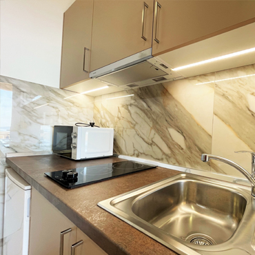 Attrezzatura da cucina di base, forno a microonde, frigorifero, piano cottura elettrico, bollitore. Per altri articoli potete contattarmi e ve lo fornirò.